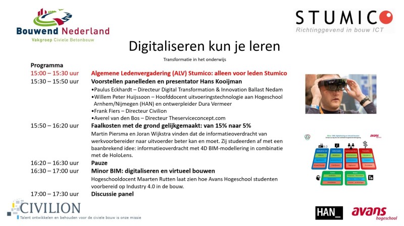 Op 8 april organiseerde Stumico in samenwerking met Civilion, Avans Hogeschool, HAN en de vakgroep Civiele Bouw van Bouwend Nederland het event Digitaliseren kun je leren. In twee uur tijd zoomden we in op de digitale transformatie in het onderwijs. Leiden we onze vakmensen wel goed op gezien de digitale transformatie in de bouw? En hoe kunnen we het onderwijs meer aan laten sluiten bij wat er gebeurt op de werkvloer? We lieten diverse interessante praktijkvoorbeelden zien. Ook gingen we in discussie met een panel van specialisten én met jou.