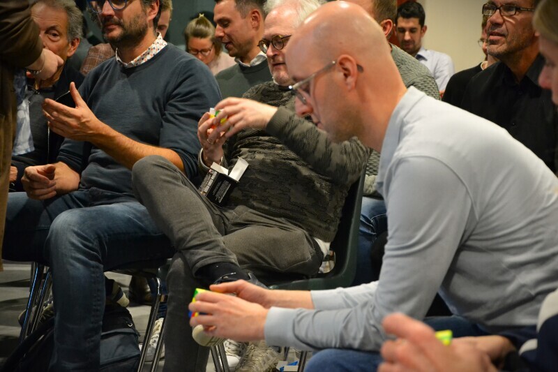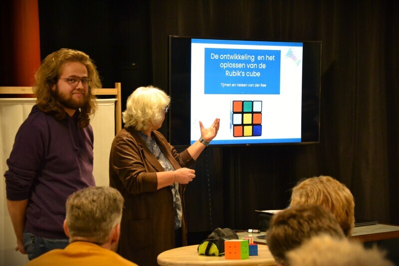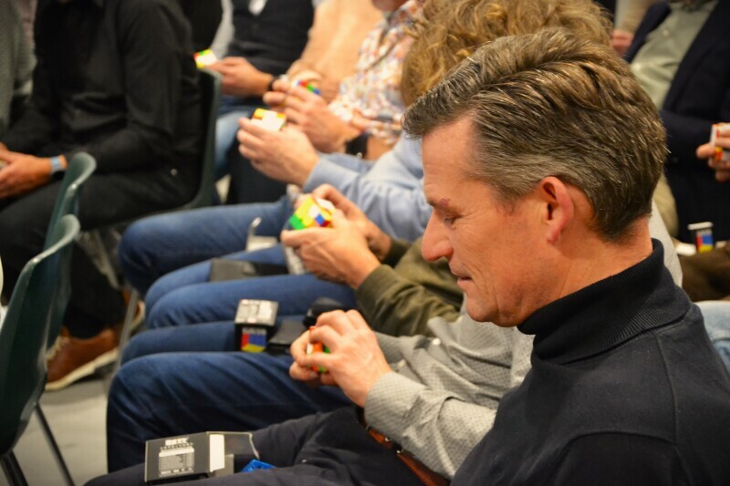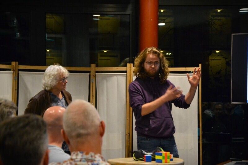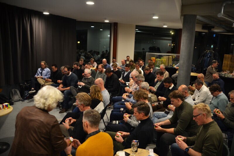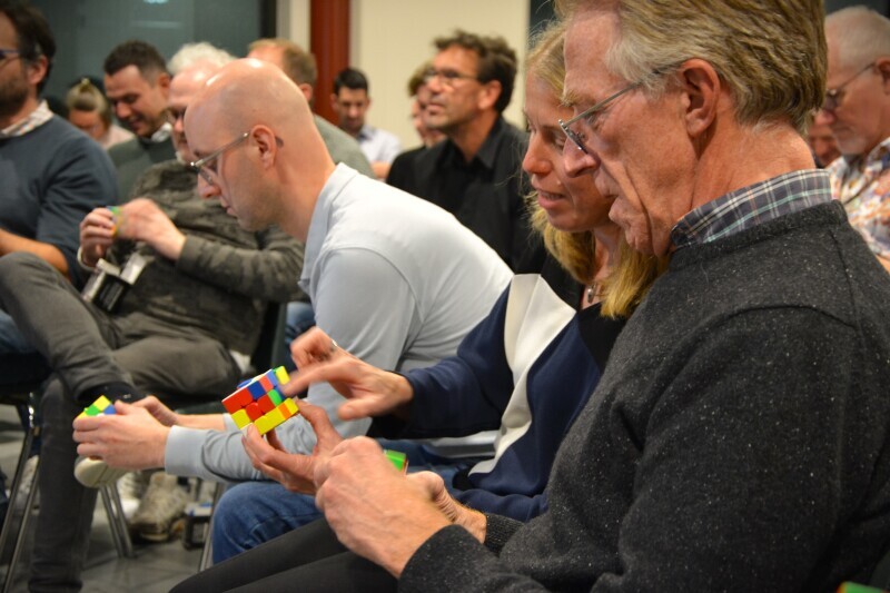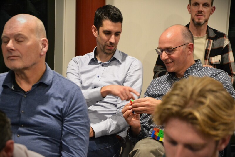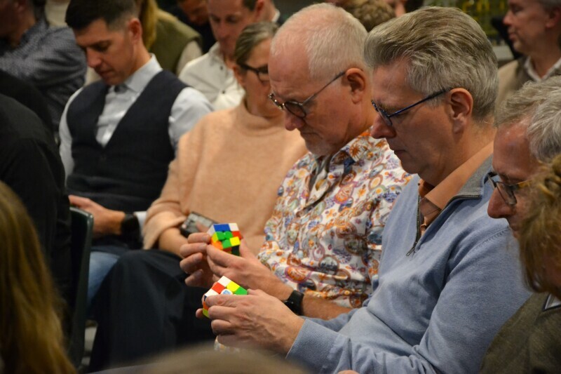 De laatste Stumico-bijeenkomst van 2025 eindigde met een verrassingsactiviteit: een introductie in de wereld van de Rubik’s Cube en er zelf mee aan de slag gaan. Na een uiteenzetting over de Hongaarse bedenker, Chinese varianten en internationale speedcubingwedstrijden, kreeg iedereen een eigen kubus. Met de beginnersmethode op het scherm gepresenteerd en praktijkbegeleiding door twee experts, gingen alle deelnemers zelf aan de slag. Een ludieke en uitdagende afsluiter die iedereen op de proef stelde én met een puzzel naar huis liet gaan.